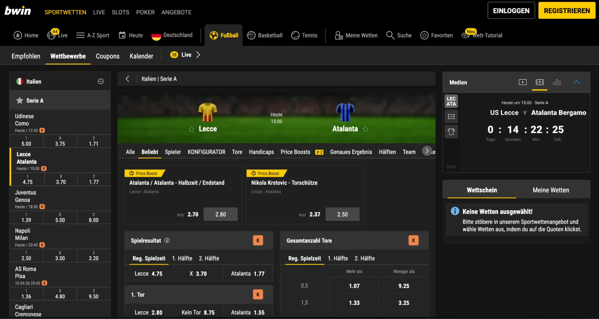 Um es dir vorstellbar zu machen, zeigen wir dir den Weg anhand eines praktischen Beispiels. In unserer Redaktion wollten wir uns den bwin Willkommensbonus holen und haben uns überlegt, ob uns ein kleiner Anteil reicht, oder ob wir alles abgreifen wollen. Da wir schon einige Erfahrung mit Sportwetten gesammelt haben, war unsere erste Einzahlung das Maximum von 100 €, denn bwin verspricht ja, diesen Betrag zu verdoppeln, wenn wir ihn bei einer qualifizierenden Wette einsetzen. Anschließend haben wir ein Spiel gesucht, bei dem eine ziemlich sichere Wette mit einer Quote, die die Mindestquote von 1,70 überschreitet. Die Serie A bot einige Spiele mit Potenzial und US Lecce gegen Atalanta Bergamo bot eine gute Quote von 1,77 auf einen Auswärtssieg und genau auf diesen haben wir gesetzt. Der Favorit hat dann auch mit 3:0 gewonnen, was uns einen Gewinn von 77 € beschert hat.